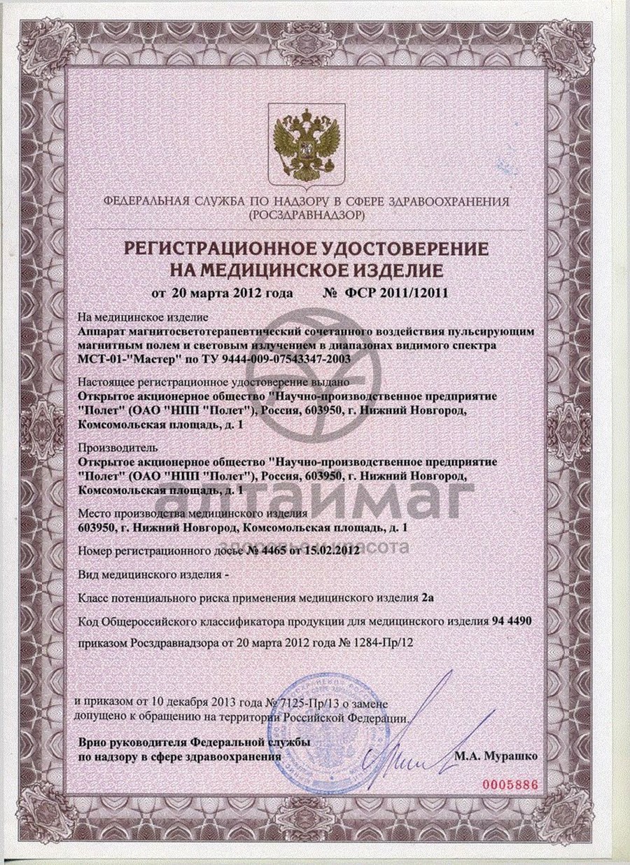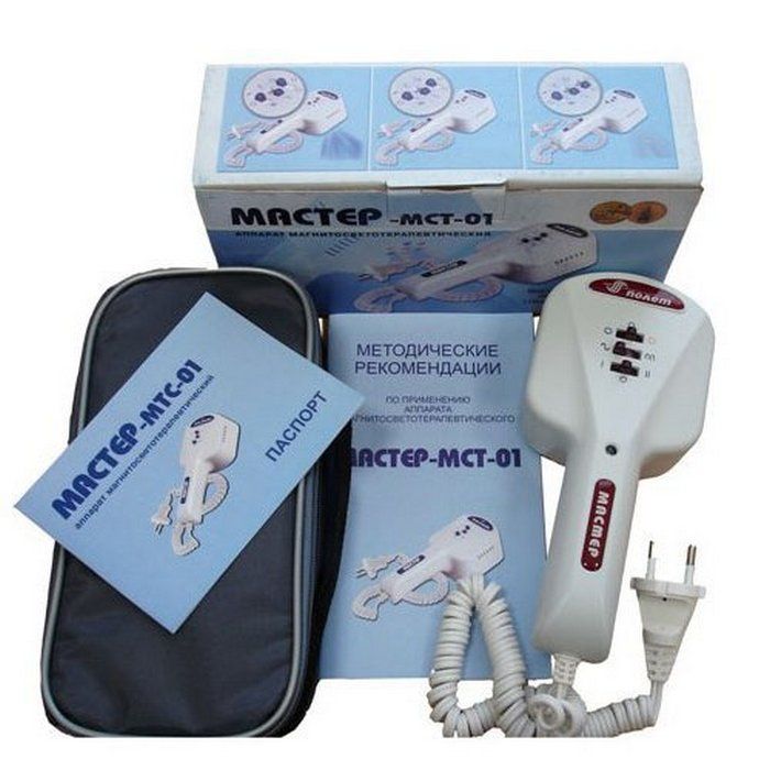 - Аппарат магнитосветотерапевтический МСТ-01 Мастер предназначен для проведения физиотерапии методом сочетанного терапевтического воздействия пульсирующим (или переменным) магнитным полем и некогерентным монохроматическим световым излучением в синем или оранжевом спектрах света.