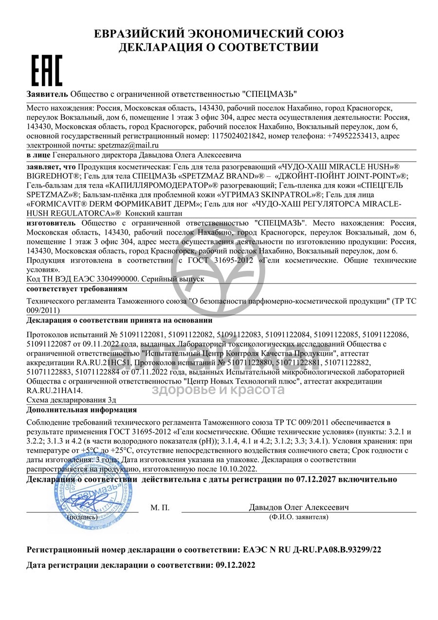 Крем для растирания в области суставов и позвоночника. Содержит оптимально подобранный комплекс. Является источником хондроитина и глюкозамина. Муравьиный спирт, входящий в состав, активирует обменные процессы, быстро проникает в глубинные слои дермы, стимулируя активное восстановление поврежденных и старых клеток и обеспечивая их полезными микроэлементами.