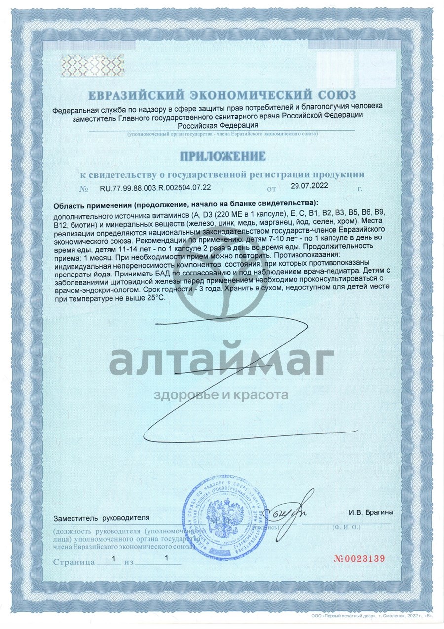 Антислеживающие агенты микрокристаллическая целлюлоза и кальциевая соль стеариновой кислоты, L-аскорбиновая кислота, кальция карбонат, никотинамид, железа фумарат, DL-альфа-токоферол ацетат, магния оксид, цинка цитрат, марганца глюконат, кальция D-пантотенат, холекальциферол, ретинола ацетат, натрия селенит, цианокобаламин, пиридоксина гидрохлорид, калия хлорид, рибофлавин, тиамина гидрохлорид, меди глюконат, фолиевая кислота, калия йодид, хрома пиколинат, D-биотин, капсула (желатин).Способ применения